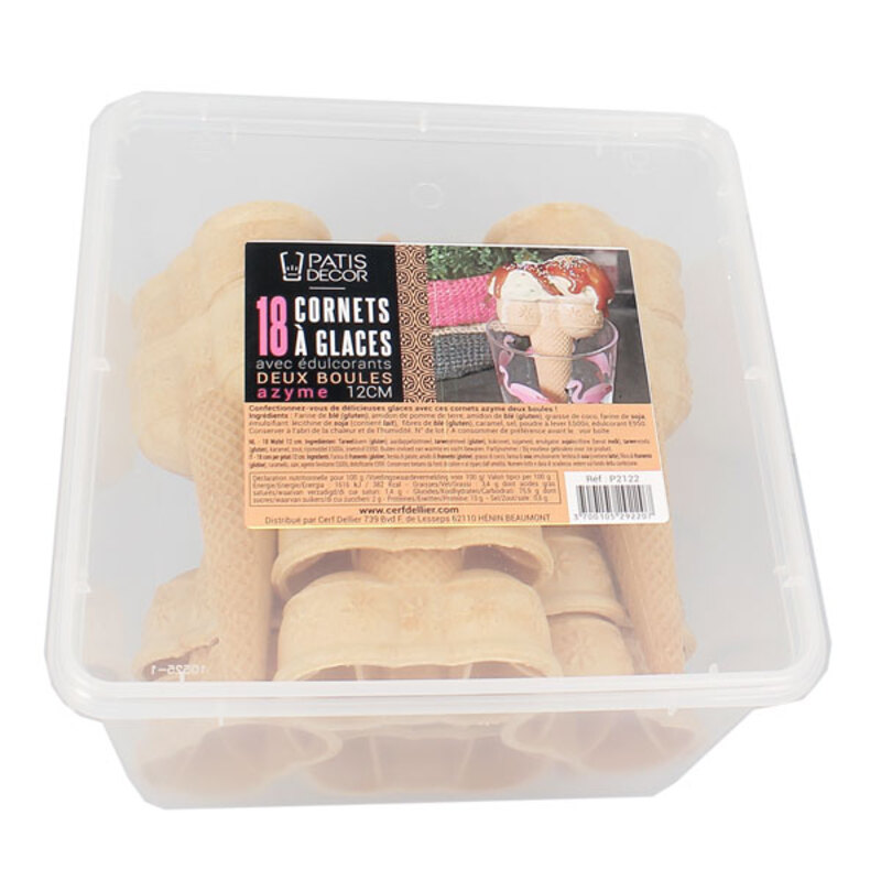 Boîte refermable de 18 cornets de glace moulés doubles en azyme à bord droit, que vous pouvez remplir de crème glacée, de sorbet ou encore, de fruits. Ils ont une capacité de 2 boules de glace.