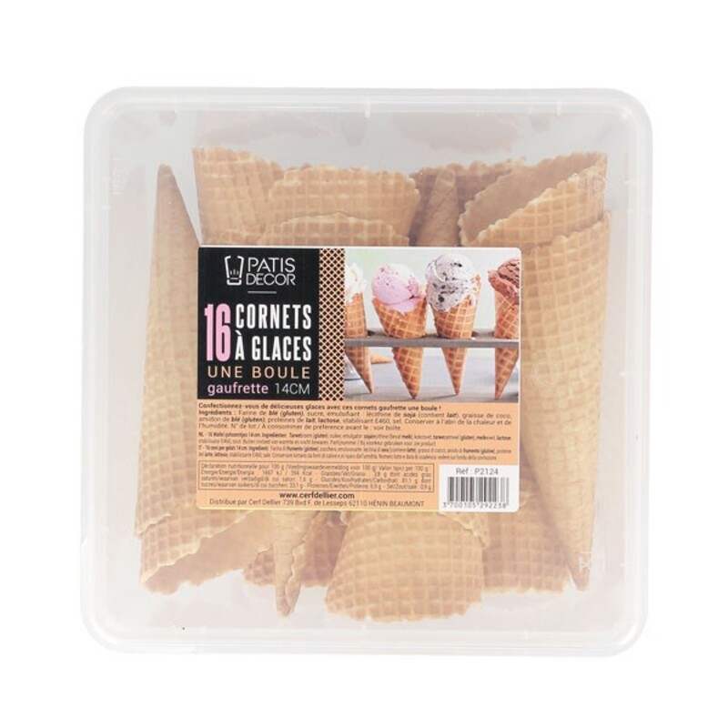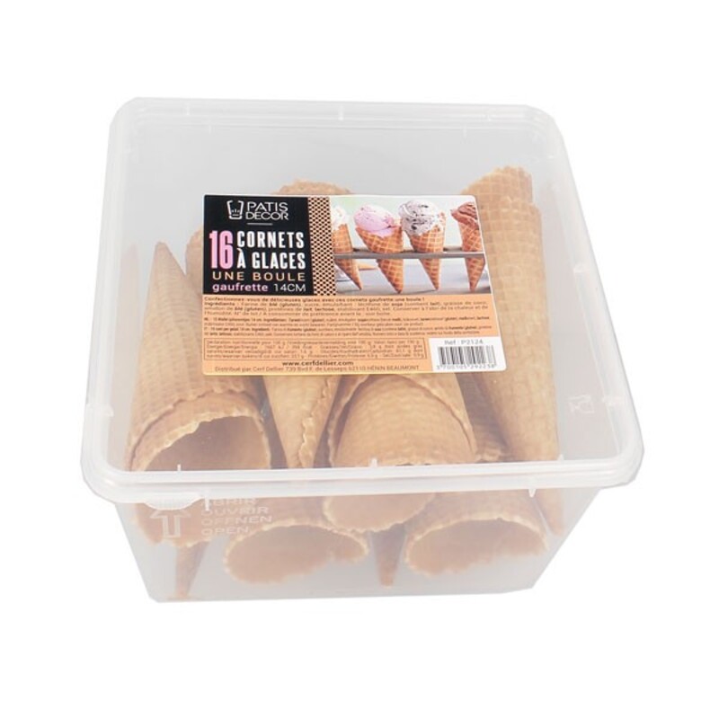 Boîte refermable de 16 cornets à glace gaufrés à bord dentelé, que vous pouvez remplir de crème glacée, de sorbet ou encore, de fruits. Ils ont une capacité d’une boule de glace.