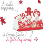 Décorez votre bûche sur le thème de Noël avec deux jolies décos en papier aptes au contact alimentaire et ses 3 cake toppers !