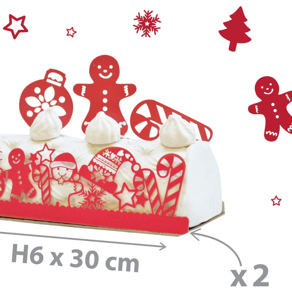 Cette décoration pour bûche est l’élément parfait à intégrer à votre dessert avec ses motifs typiques et traditionnels de Noël : sucre d’orge, bonhomme de neige, bonhomme pain d’épices…