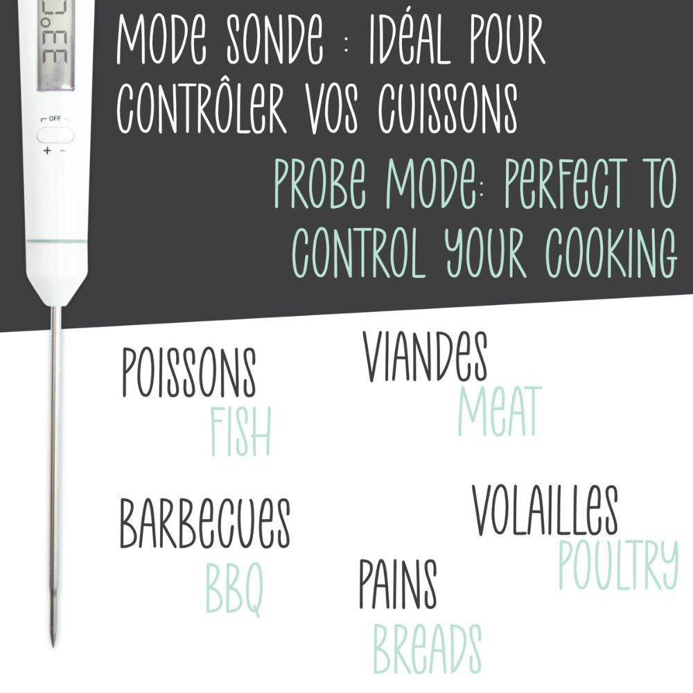 Pratique, il sonne une fois la température souhaitée atteinte. Ce thermomètre haute précision va de -20 à +250°C, et son fouet amovible permet 2 utilisations possibles et un nettoyage facile.