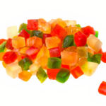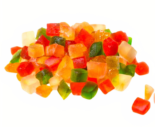 La macédoine de fruits confits tricolores est un mélange sucré, coloré et délicieux utilisé principalement en pâtisserie pour agrémenter divers desserts. Elle est composée de petits morceaux de fruits confits, souvent de trois couleurs distinctes (d’où « tricolore »), ce qui lui donne un aspect visuellement attrayant.