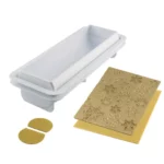 Le Kit contient : la gouttière à bûche en plastique rigide (non adapté au four) + 2 tapis en silicone platinium (1 tapis avec texture lisse et 1 tapis avec des décors flocon de neige).