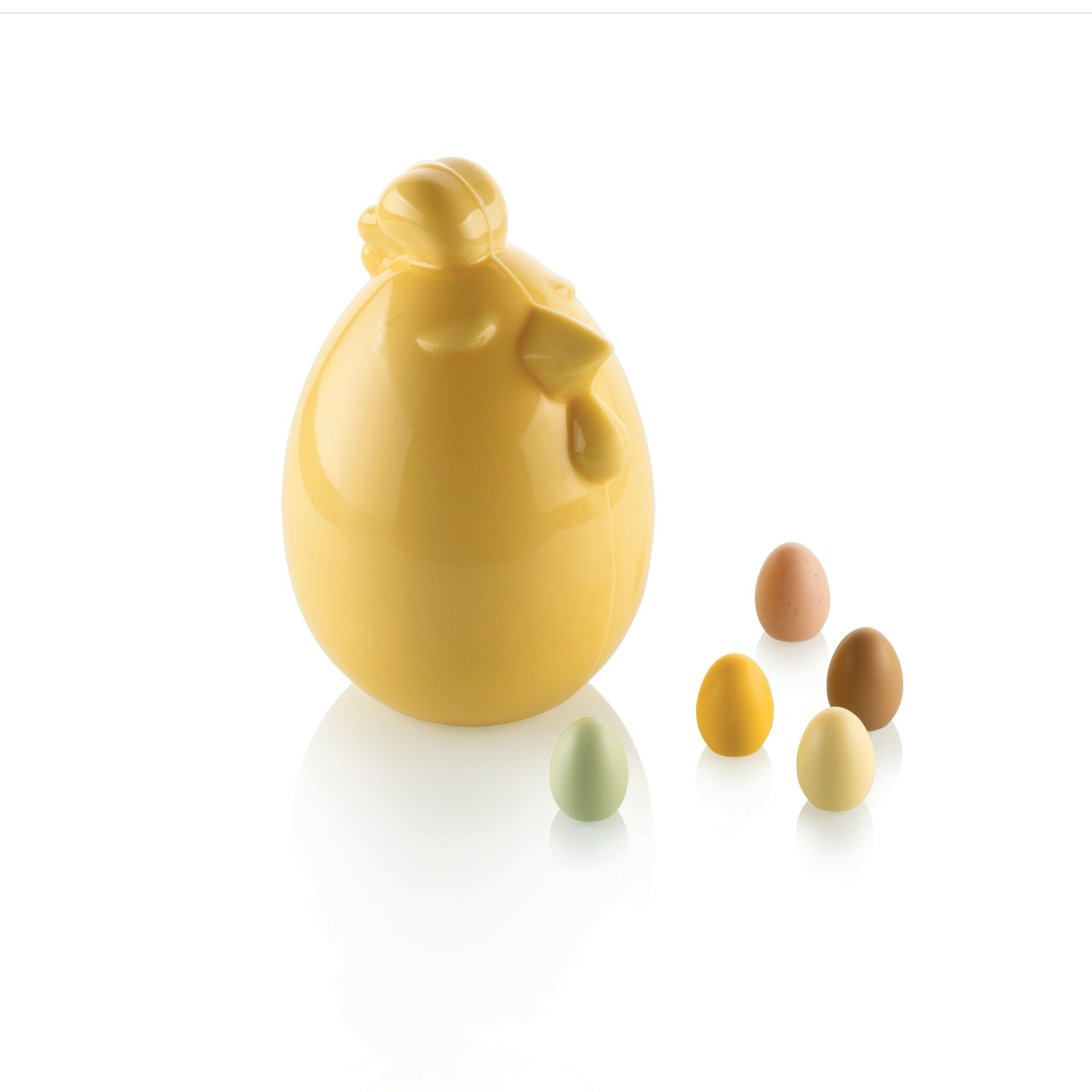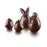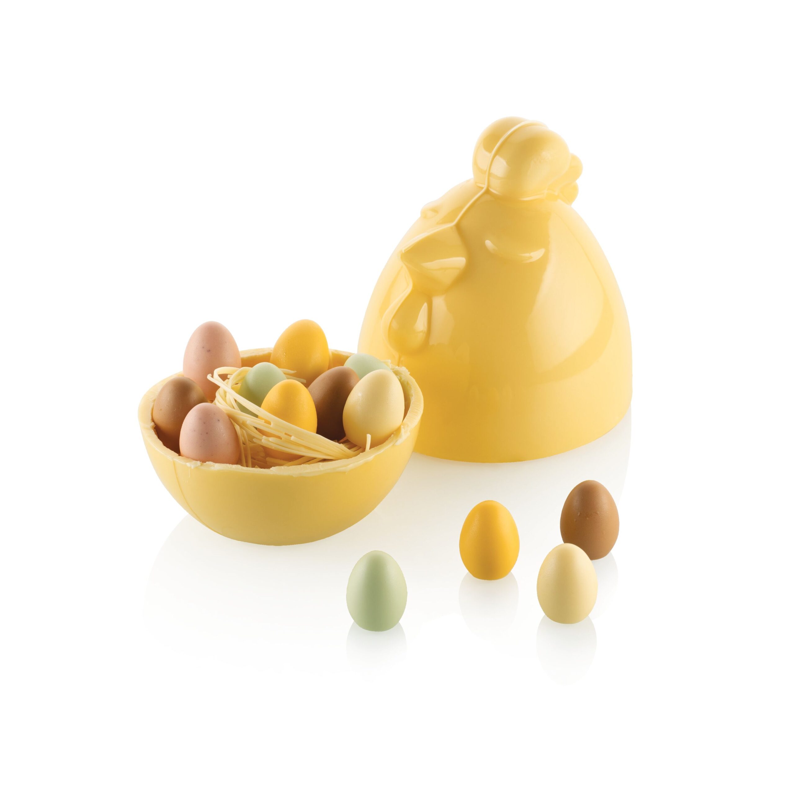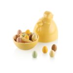 Kit de moules thermoformés réutilisables créés par les designers de Silikomart pour la réalisation d’un sujet 3D en chocolat en forme de poule.