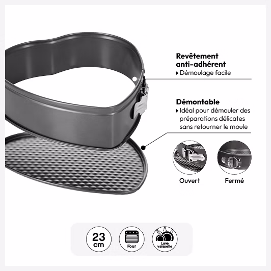 Le moule à pâtisserie, motif en forme de cœur, est un accessoire de cuisine indispensable pour tous les amateurs de pâtisserie. Les moules à gâteaux donnent à nos pâtisseries leur forme originale et leur conception correcte permet de démouler le produit fini sans en perturber la structure, sans le casser et sans qu’il ne se désagrège.