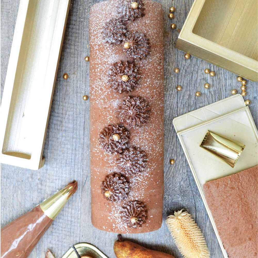 Un tapis génoise – semelle silicone 30 x 8 cm pour créer votre biscuit, votre croustillant à la dimension de la bûche et réussir un dessert de Noël personnalisé, digne d’un grand pâtissier.